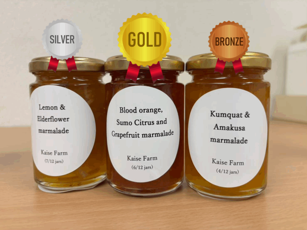 仲屋の柑橘で作ったマーマレードを12品出品、そのうち9品が受賞し、なんと山田理江様が作られた「Blood orange, Sumo Citrus and Grapefruit marmalade(ブラッドオレンジ、不知火、グレープフルーツのマーマレード)」が金賞を受賞しました!